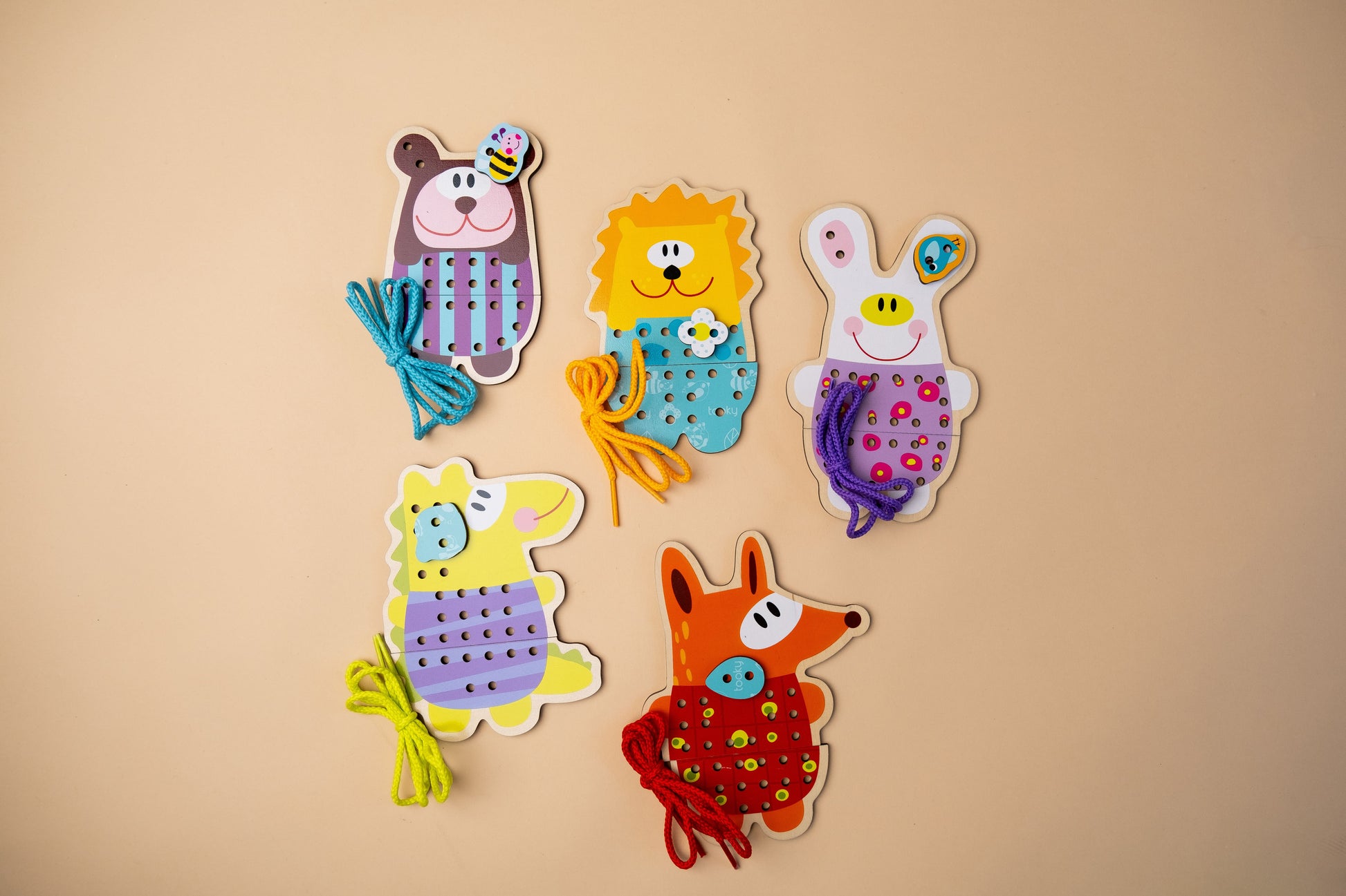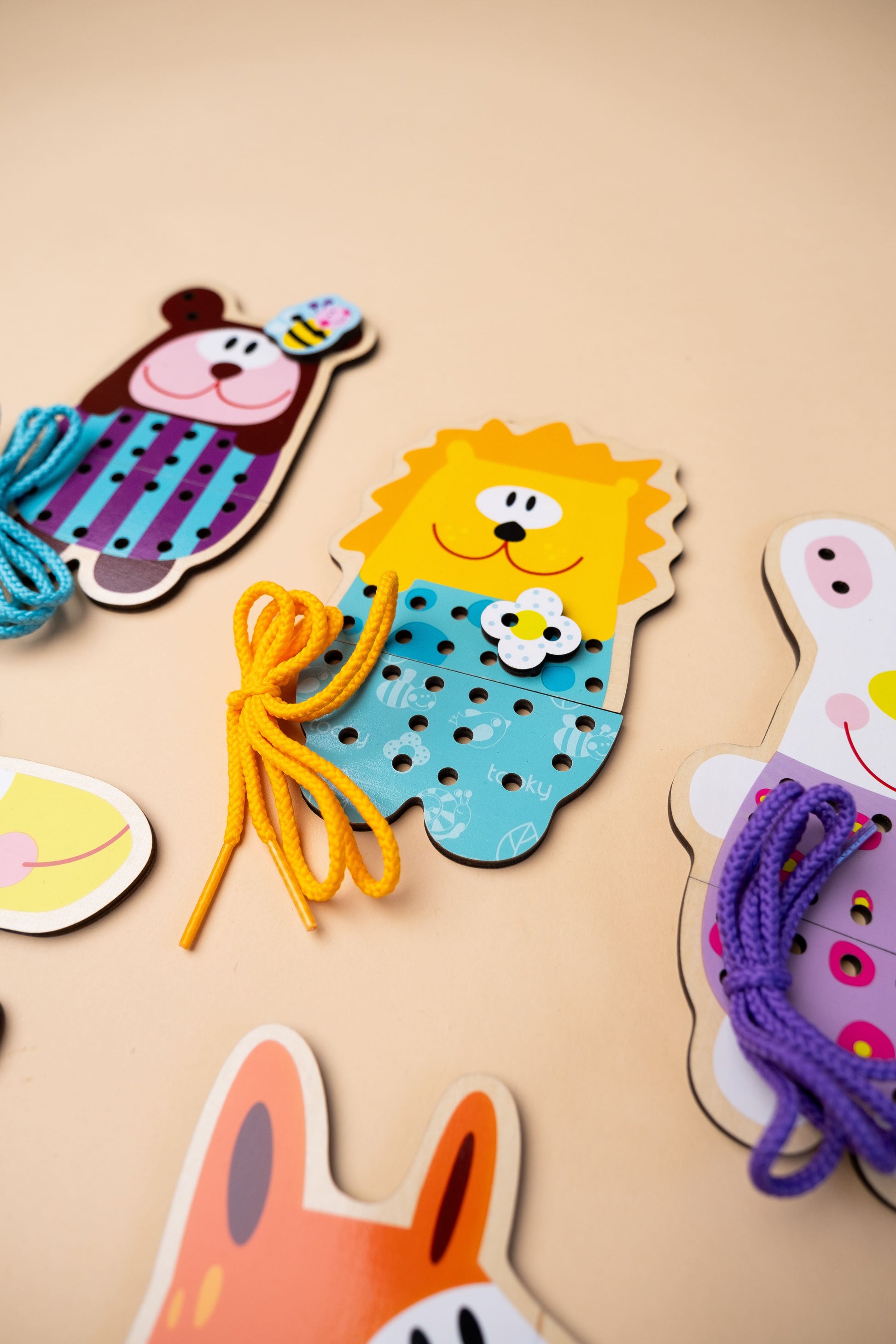 Lvinamasis varstymo žaidimas - smagus edukacinis žaislas vaikams, kuris padeda lavinti smulkiąją motoriką, rankų ir akių koordinaciją bei ugdyti kantrybę. Rinkinyje rasite 5 skirtingus gyvūnėlius, kuriuos vaikas galės papuošti vėrimo virvelėmis, mokydamasis suvarstymo ir rišimo įgūdžių.