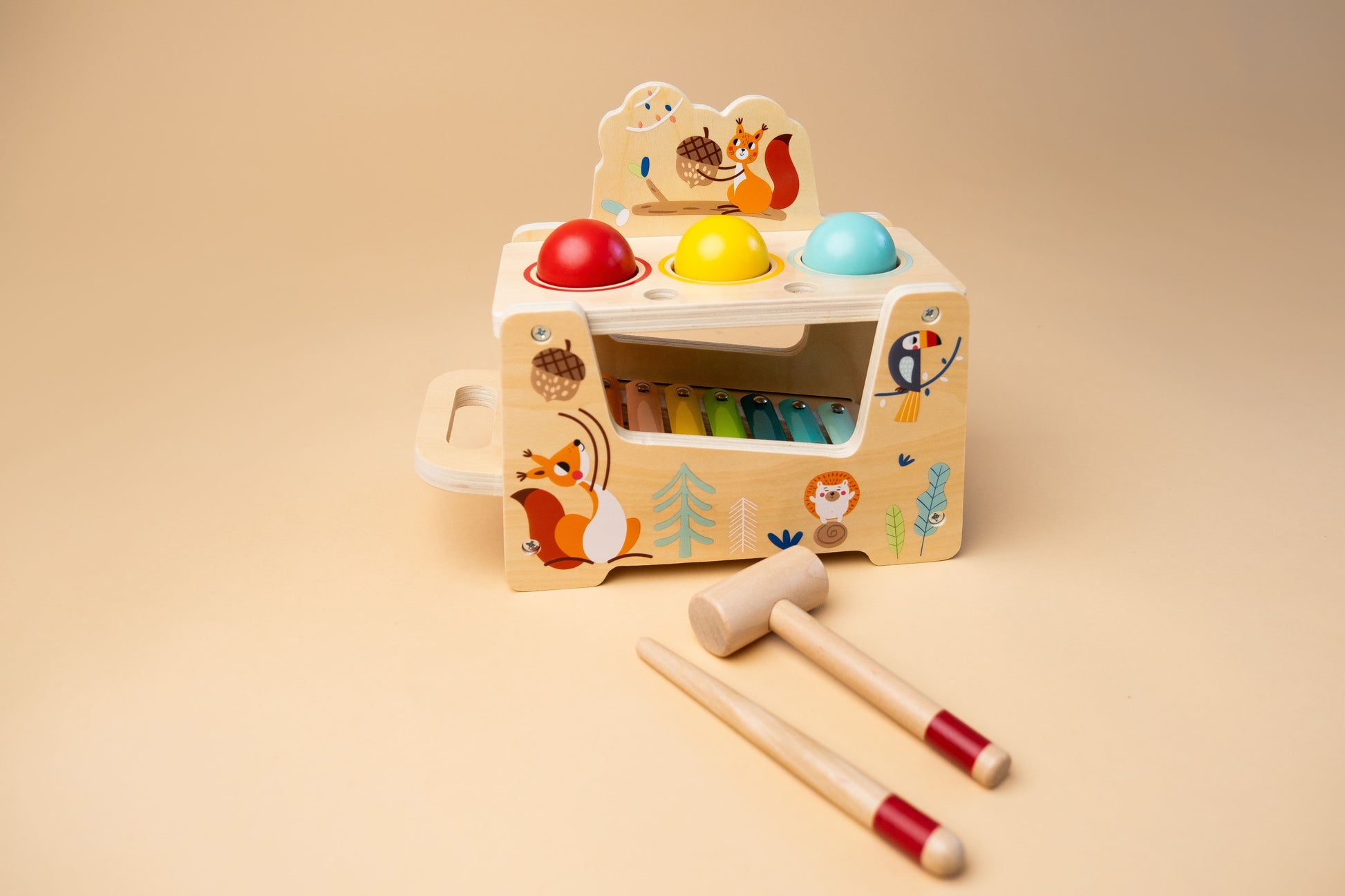 Plaktuko ir kamuoliuko žaidimas - puikius pasirinkimas ankstyvam vaikų ugdymui, nes jis derina kelias veiklas į vieną. Vaikas naudoja medinį plaktuką, kad įmuštų spalvotus kamuoliukus į skylutes. Kamuoliukai, nukritę ant ksilofono, sukelia garsą. Ksilofonas - gali būti naudojamas kaip atskiras muzikos instrumentas ištraukiant iš žaislo. Tai skatina smalsumą, tyrinėjimą ir mokymąsi per žaidimą.