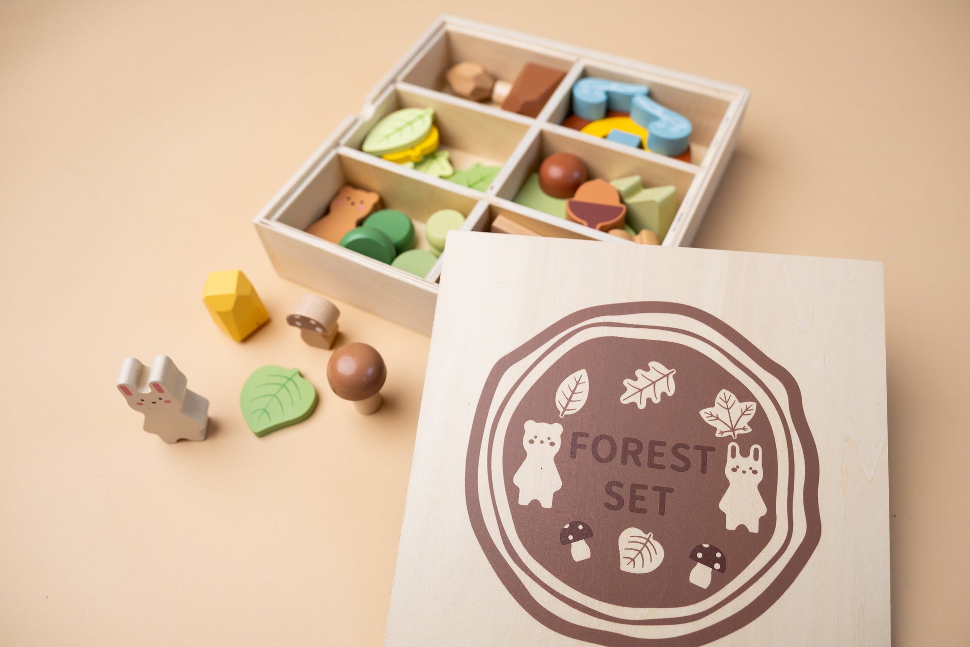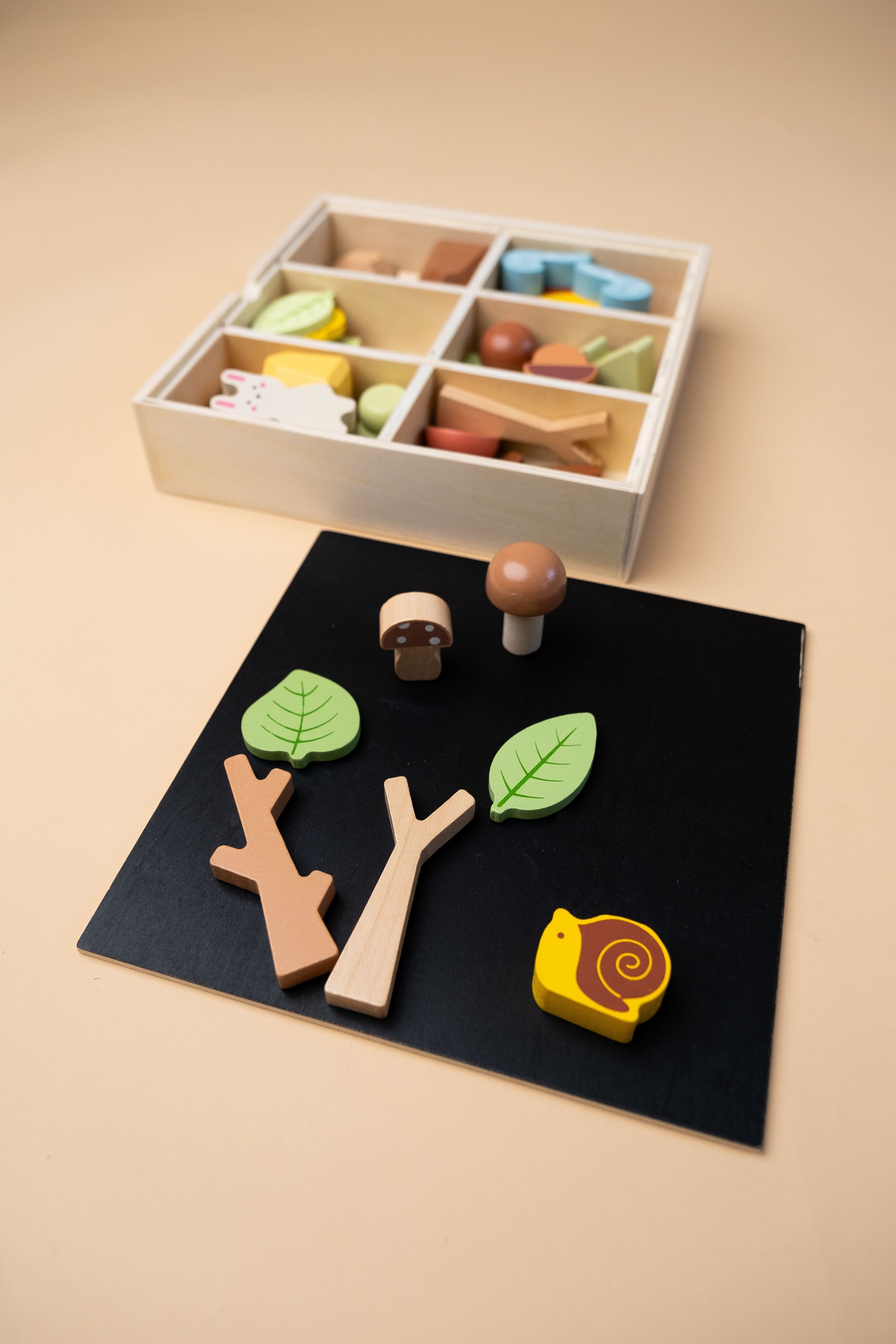 Tai lavinamasis medinis žaislų rinkinys vaikams nuo 3 metų. Jame yra detalių, kurios vaizduoja įvairius miško elementus - gyvūnus, augalus, grybus ir kt. Šis žaidimas skatina vaizduotę, kūrybiškumą, smulkiąją motoriką ir padeda vaikams kurti savo istorijas bei pažinti gamtą.